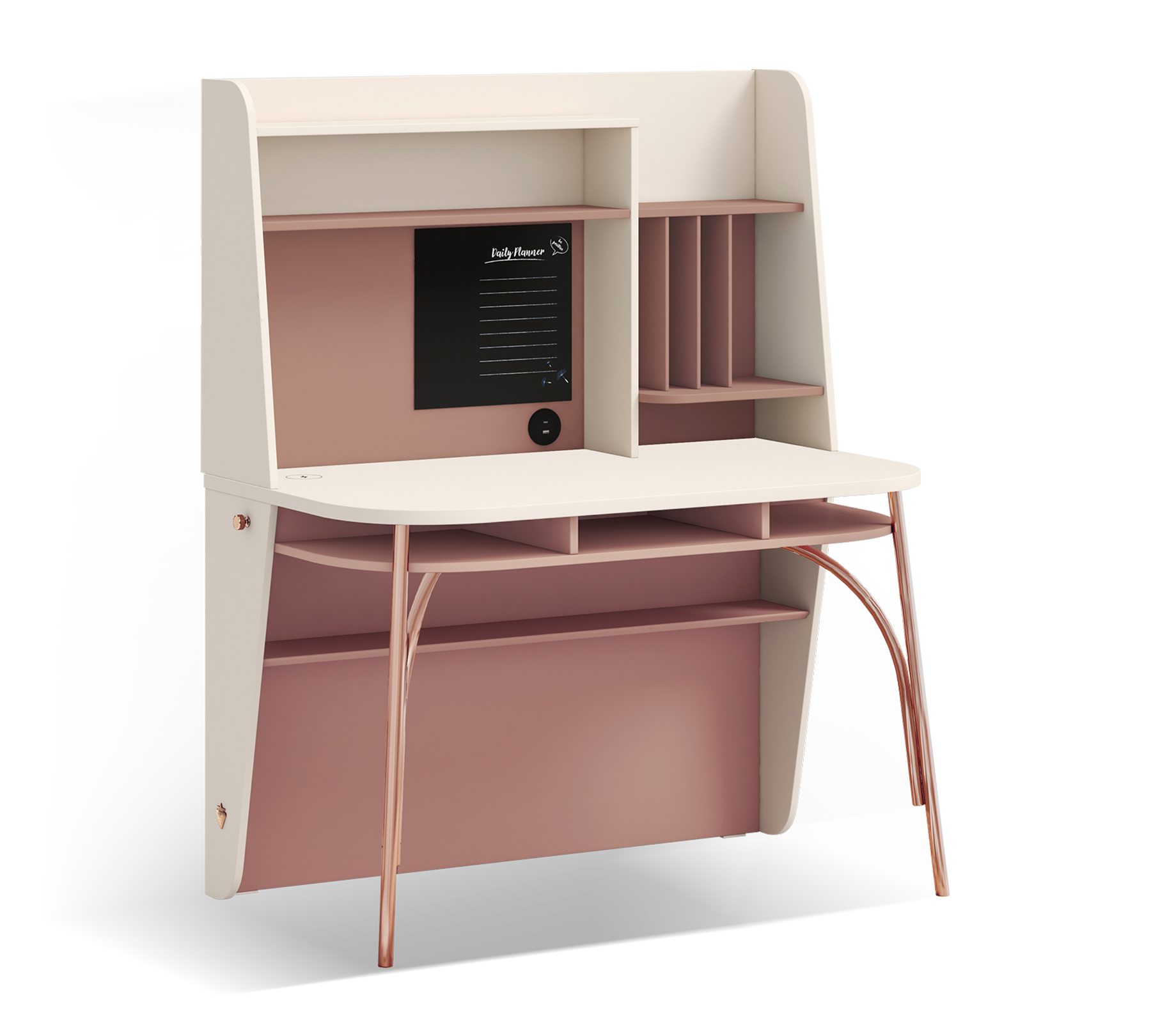 Благодаря гармонии цветов Розетта и Кремового Бежевого, он предлагает эстетичный вид, в то время как металлические ножки с покрытием розового золота придают окружению изящный акцент. Эргономичные размеры обеспечивают пользователю комфортный и эффективный опыт работ.