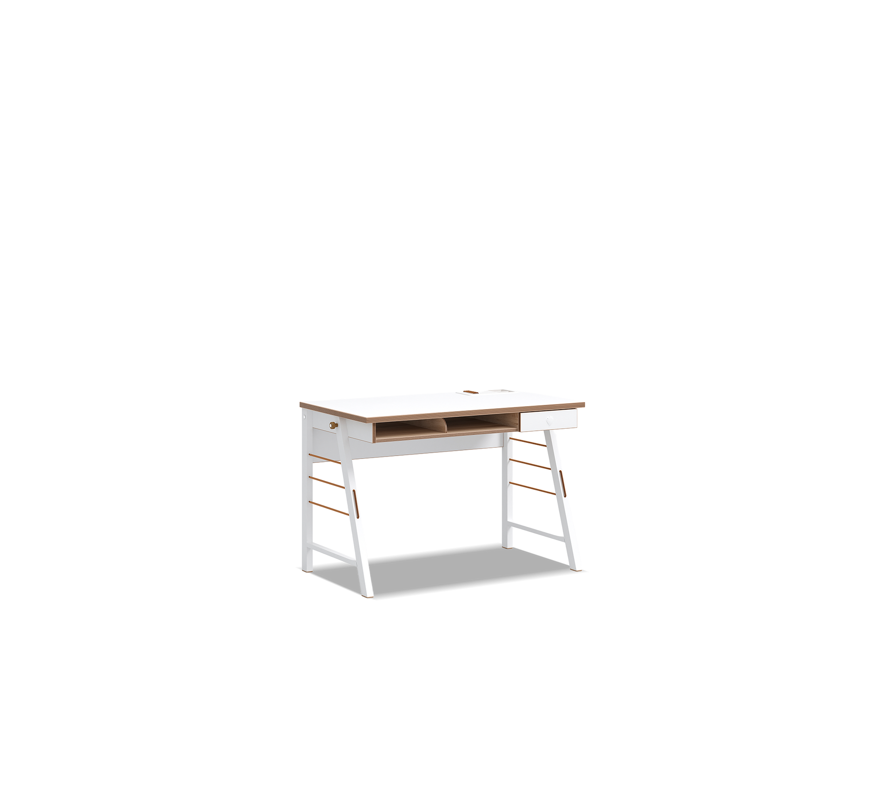 Два отделения открытой полки в нижней части рабочей зоны обеспечивают легкий доступ к вещам, необходимым в повседневной жизни, от книг до блокнотов. Металлические ножки, использованные с обеих сторон стола, придают дизайну современный вид и выделяются своей прочностью. Деталь в виде крючка на металлических ножках позволяет удобно вешать такие вещи, как сумка или наушники. Резинка, добавленная между ножками, обеспечивает звукоизоляцию и смягчает удары.